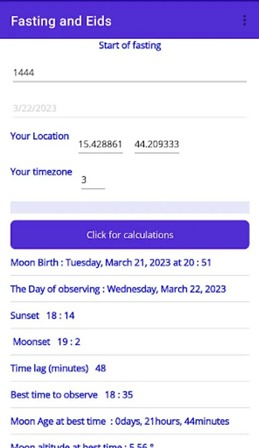 Similarly, it calculates Eid El Fitr and Eid Al-Ad'dha. It also gets Qibla direction and Islamic prayer times for both Shia and Sunna.