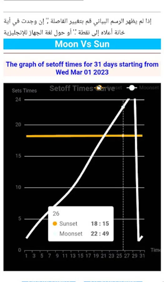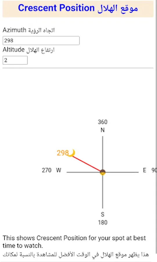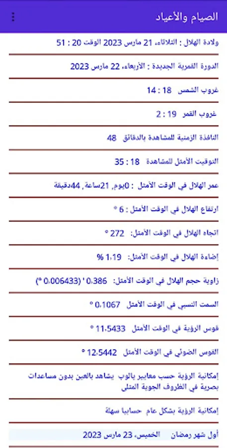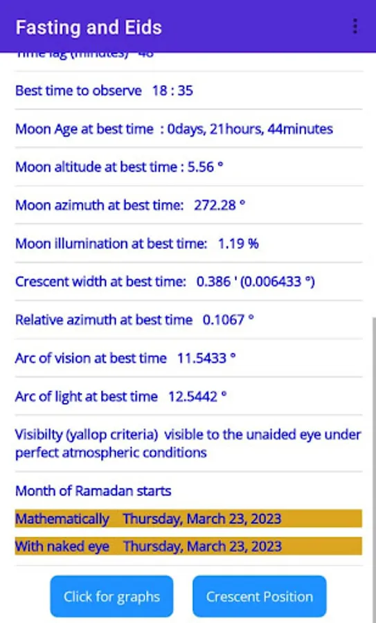 Age of the moon at that moment is calculated along with the crescent width and percentage of illumination.