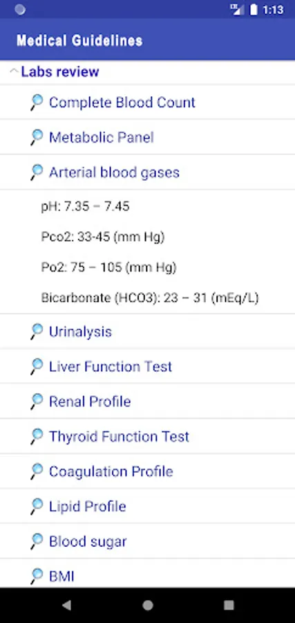 Investigations and Labs: the app contains all the tests clinicians order, including CBC, Arterial Blood Gases, Metabolic Panel, Liver Function Test, Renal Profile, Blood Sugar Tests, and much more.