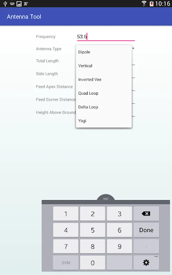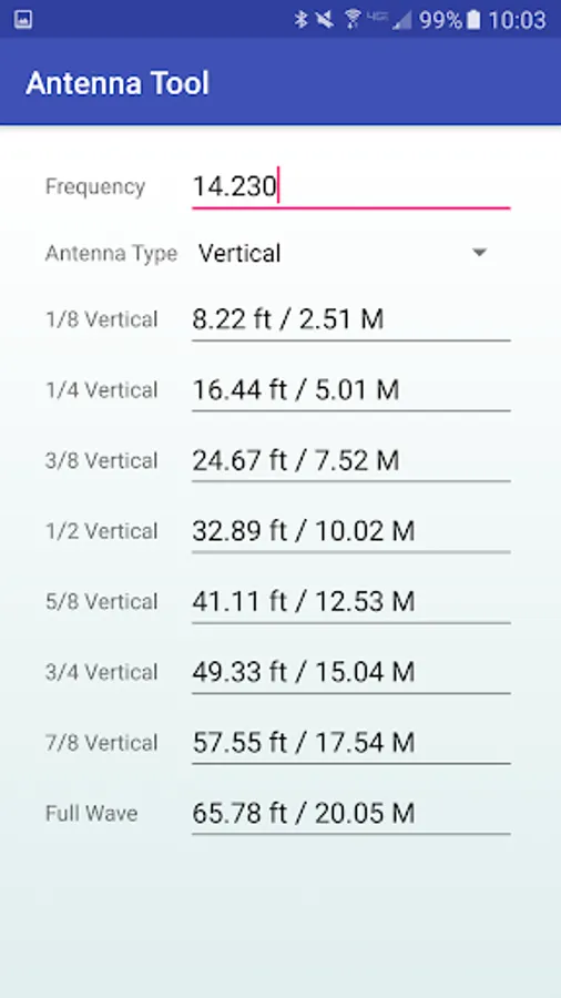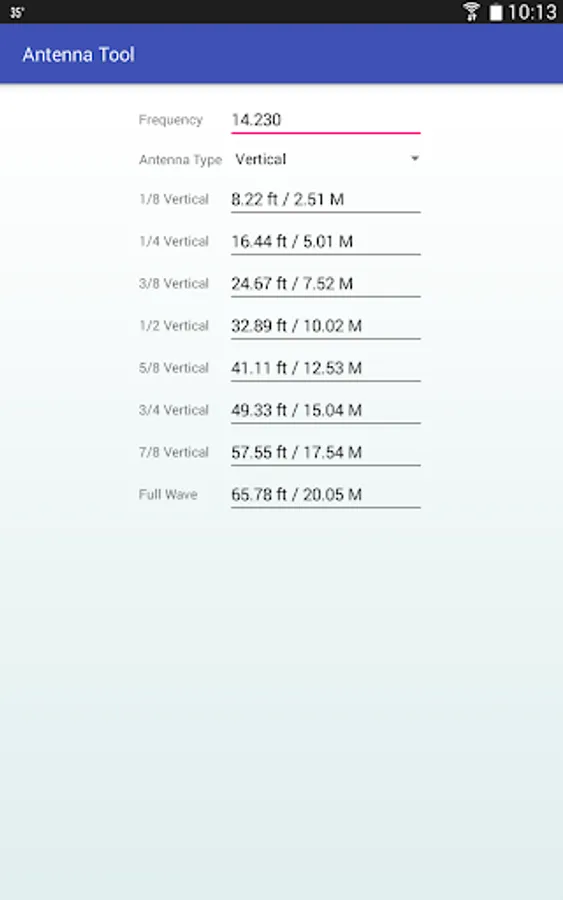 A tool to help ham radio, CB, and other radio users to create antennas of various types. Calculations available for dipole, vertical (1/8, 1/4, 3/8, 1/2, 5/8, 3/4, 7/8, and full wave), inverted vee, quad loop, delta loop, and yagi. Simply enter the frequency, select the antenna type, and all necessary calculations are displayed.