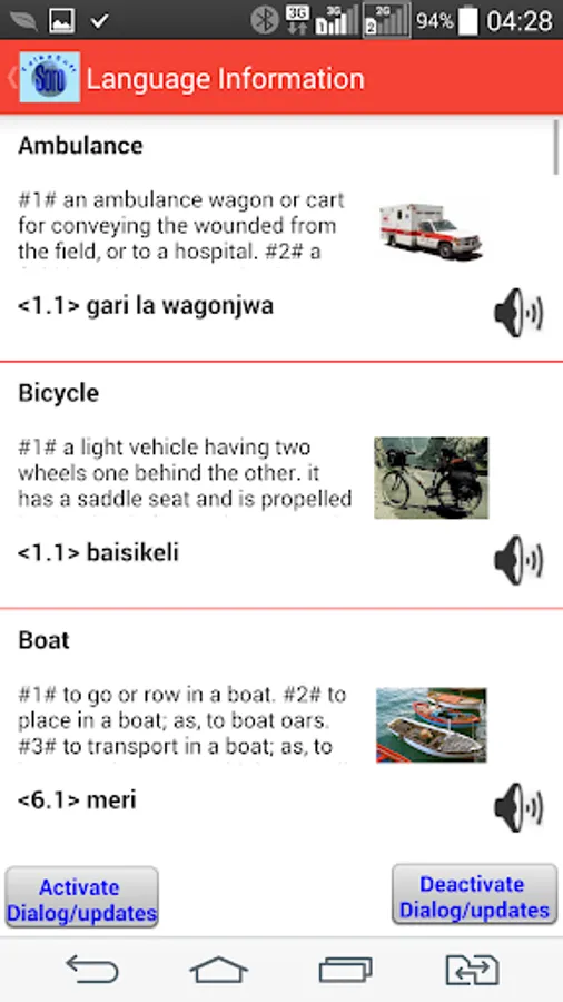 This professional version enables users to update the translated data if they are using it to teach others as there are many ways to speak a language. It also enable users to create new data translations, record and play back or delete audio Swahili data, record and play back or delete dialog audio Swahili data.
