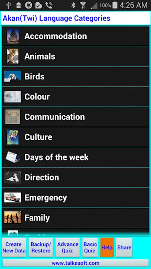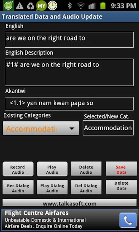 Dialog audio data helps to elaborate on the translated Akan(twi) data and may be used to teach the user what to expect in reply to what they are saying to local speakers of the language. This professional version can also be used to backup and restore newly created data.