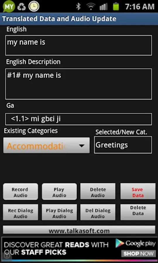 Dialog audio data helps to elaborate on the translated Ga data and may be used to teach the user what to expect in reply to what they are saying to local speakers of the language. This professional version can also be used to backup and restore updated and newly created data.