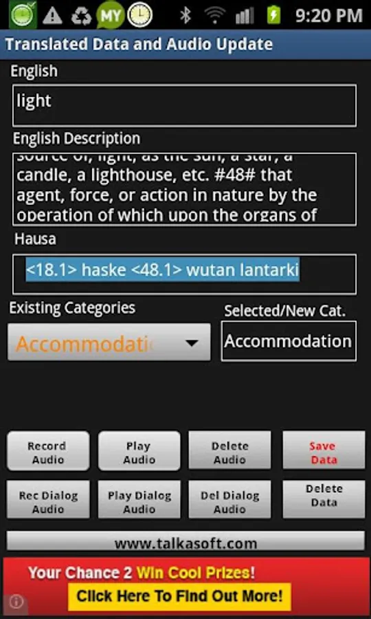 This professional version enables users to update the translated data if they are using it to teach others as there are many ways to speak a language. It also enable users to create new data translations, record and play back or delete audio Hausa data, record and play back or delete dialog audio Hausa data.