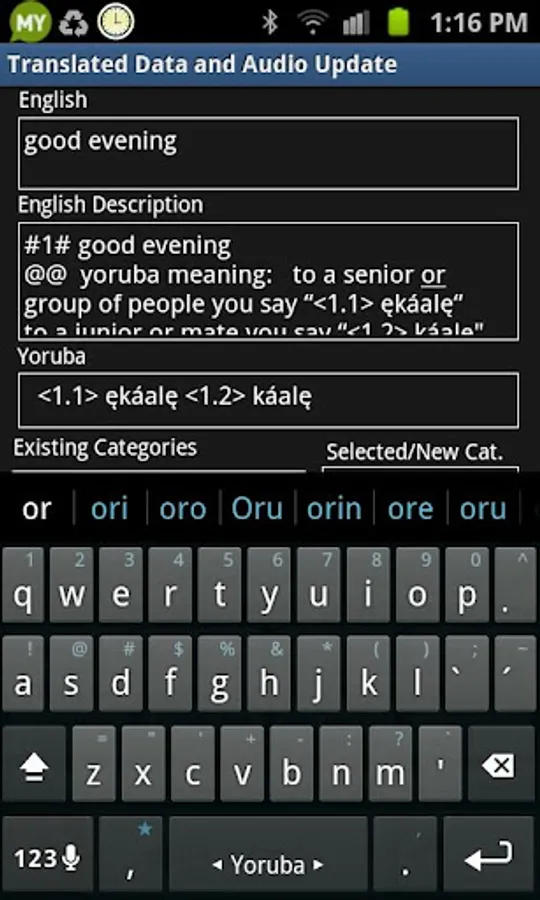 This professional version enables users to update the translated data if they are using it to teach others as there are many ways to speak a language. It also enable users to create new data translations, record and play back or delete audio Yoruba data, record and play back or delete dialog audio Yoruba data.