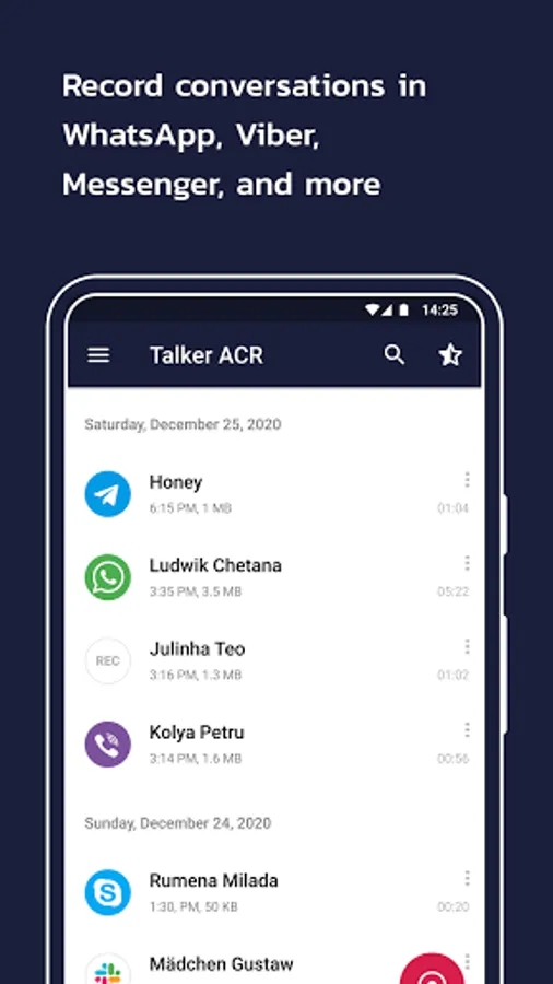 Unlike other apps of a similar kind, Talker call recorder ACR allows you to record WhatsApp calls as well as conversations on Viber, Skype, Hangouts, Facebook, and other messengers in the highest possible quality, in a matter of a few simple steps.
