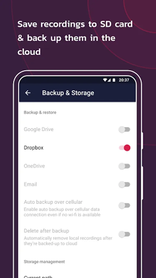 * Recordings back up in the cloud, e.g. on Google Drive, or else