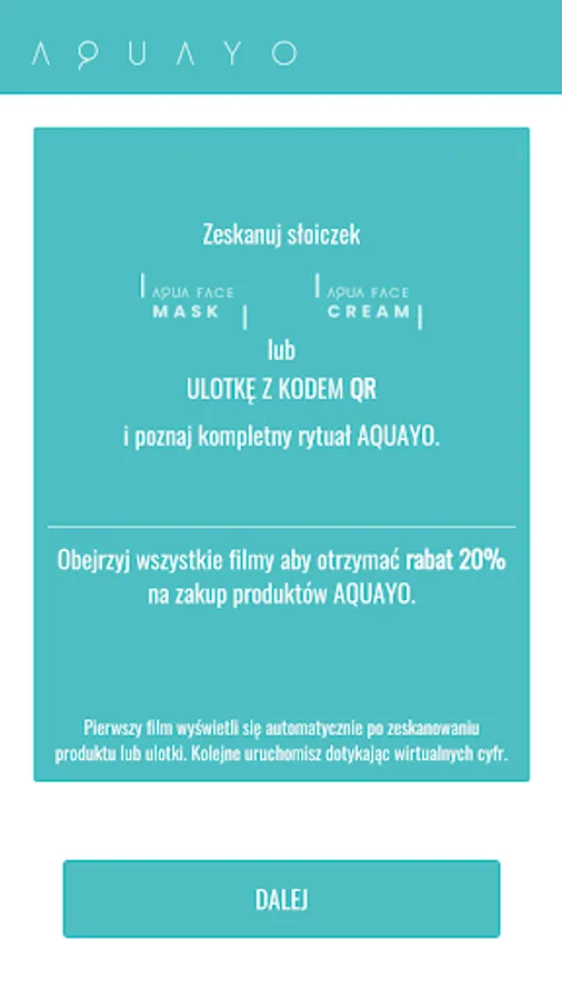 Aby uruchomić doświadczenie będziesz potrzebować produktu AQUA FACE MASK, AQUA FACE CREAM lub dołączanej do nich ulotki.