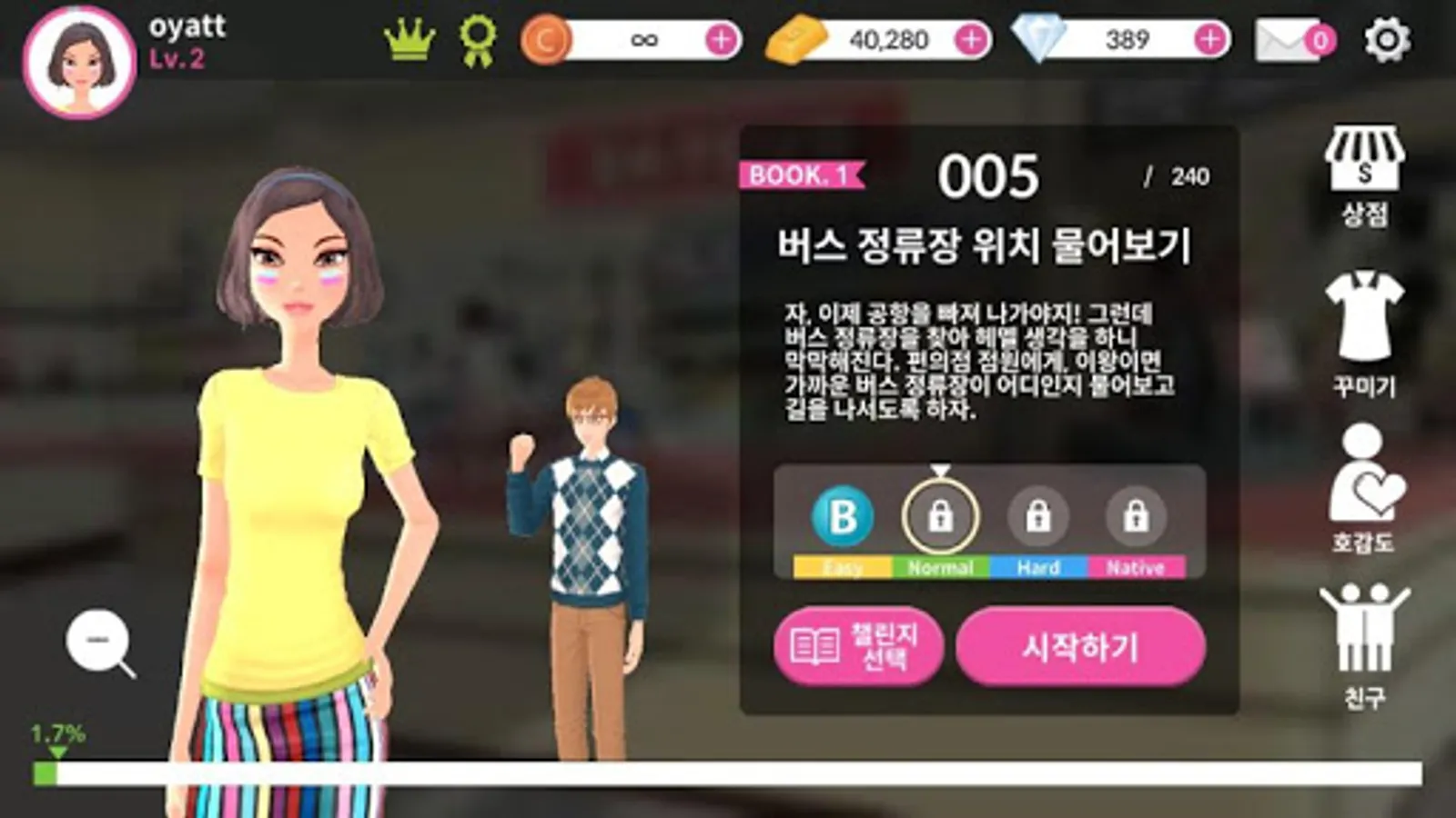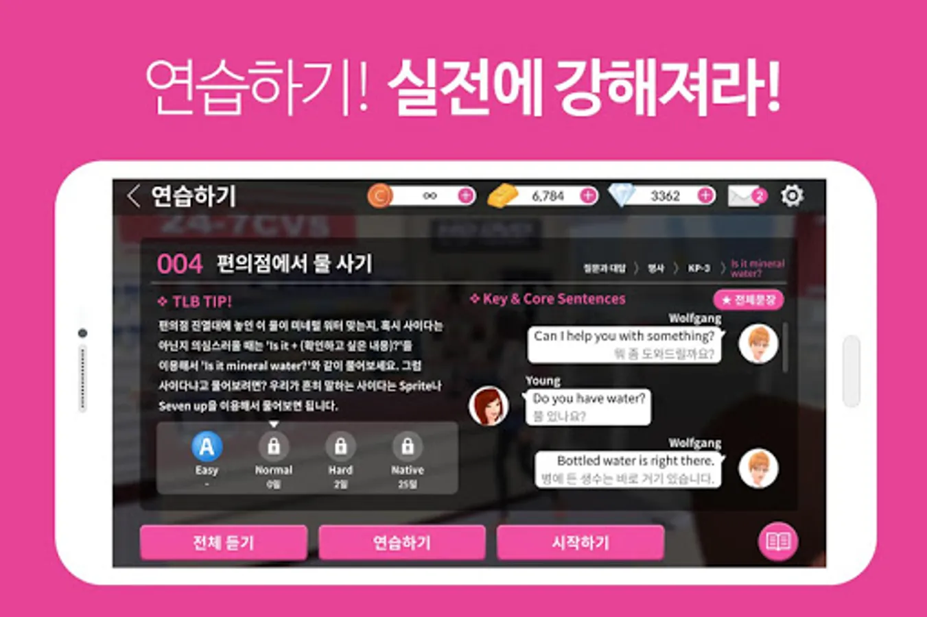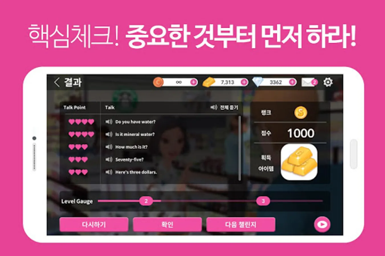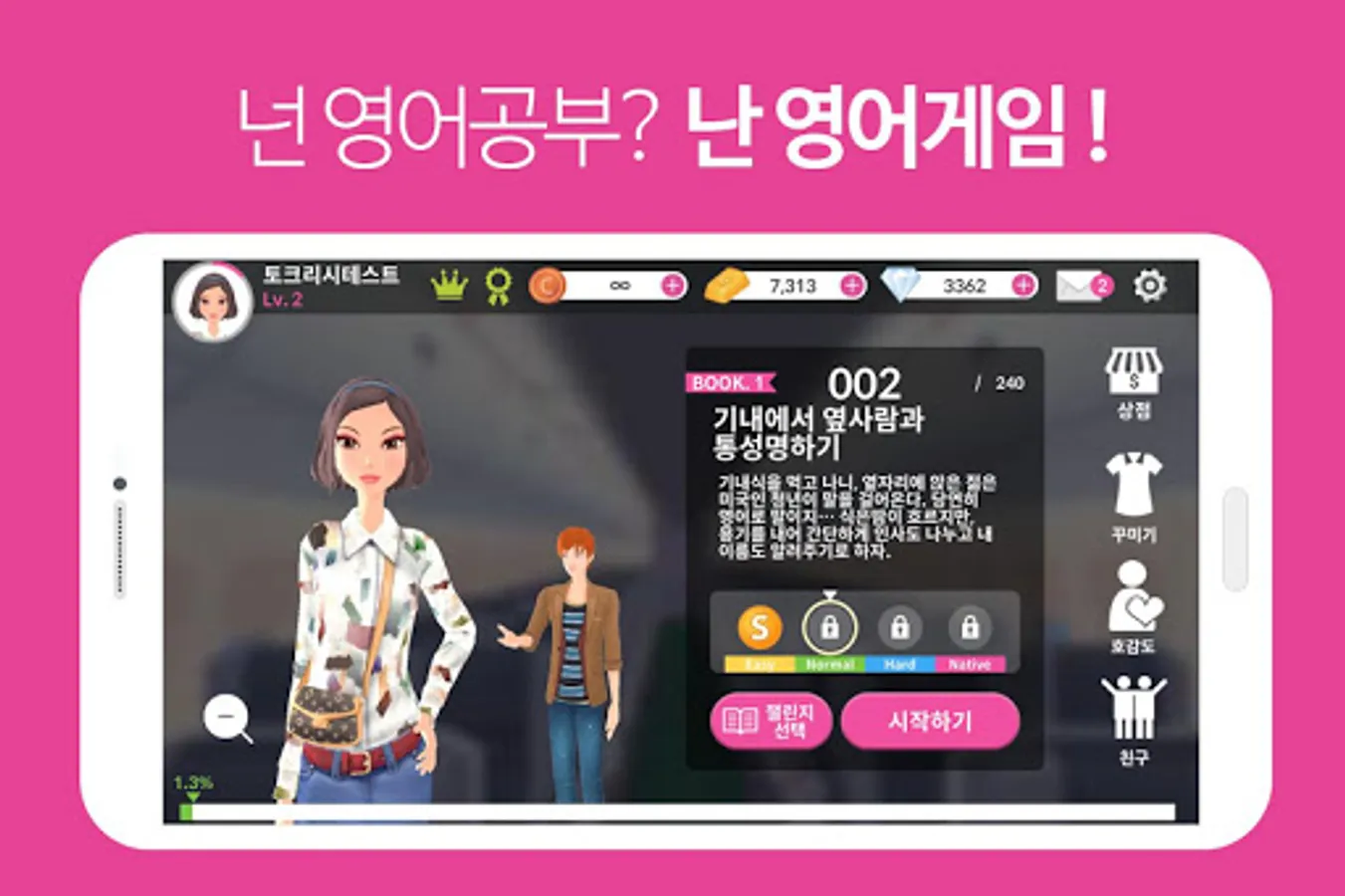 The story of Talkrish New York contains 240 essential situations that can occur during studying in the United States and 4,000 essential expressions that can be used at this time in an interesting story. The game-based learning that learns and experiences the key patterns and sentences through speech recognition solely through English speaking Service.
