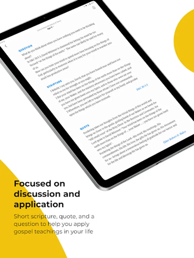 Every devotional focuses on a question that will help you ponder the scriptures more deeply and discuss how they can apply in your daily life. This helps you go beyond just reading the scriptures, so that the scriptures truly come alive in your life.
