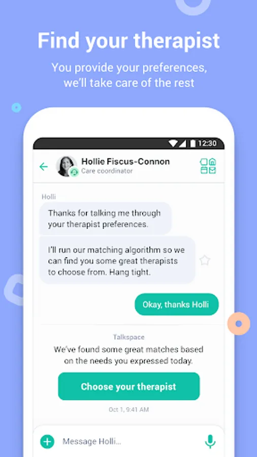 Your safety and security are our #1 priorities. Our technology is protected using banking-grade encryption and externally audited in compliance with the Health Insurance Portability and Accountability Act (HIPAA). For more information, find our complete Privacy Policy at talkspace.com/public/privacy-policy.