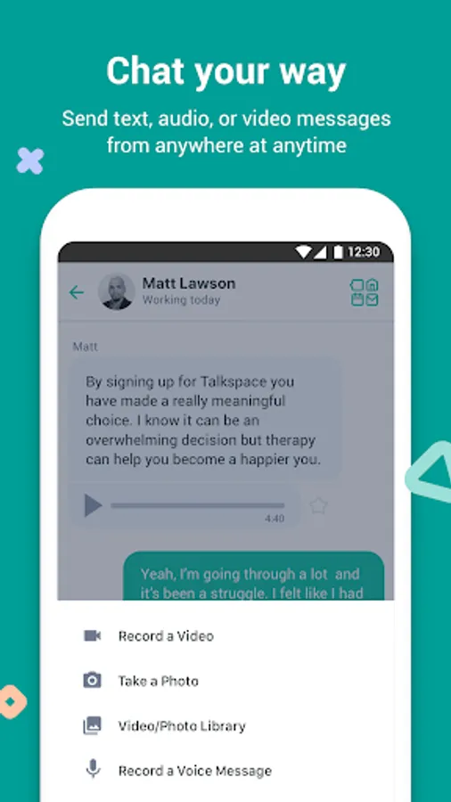 Tell us your preferences for therapy, and match with one of our therapists in your state the same day. Send your therapist unlimited text, audio, picture, or video messages from anywhere, at any time — you’ll hear back at least once a day, 5 days per week.