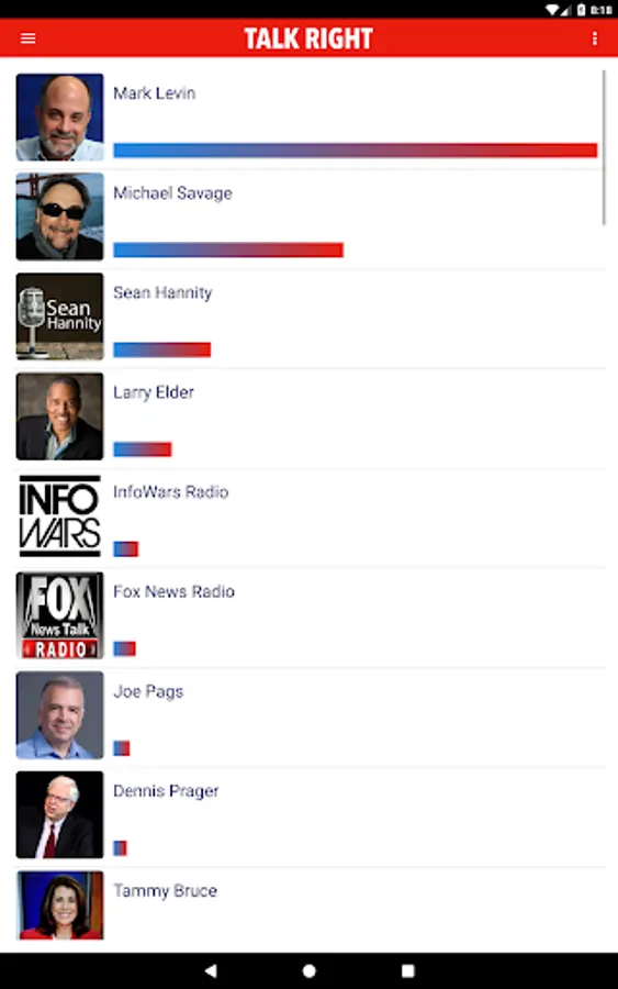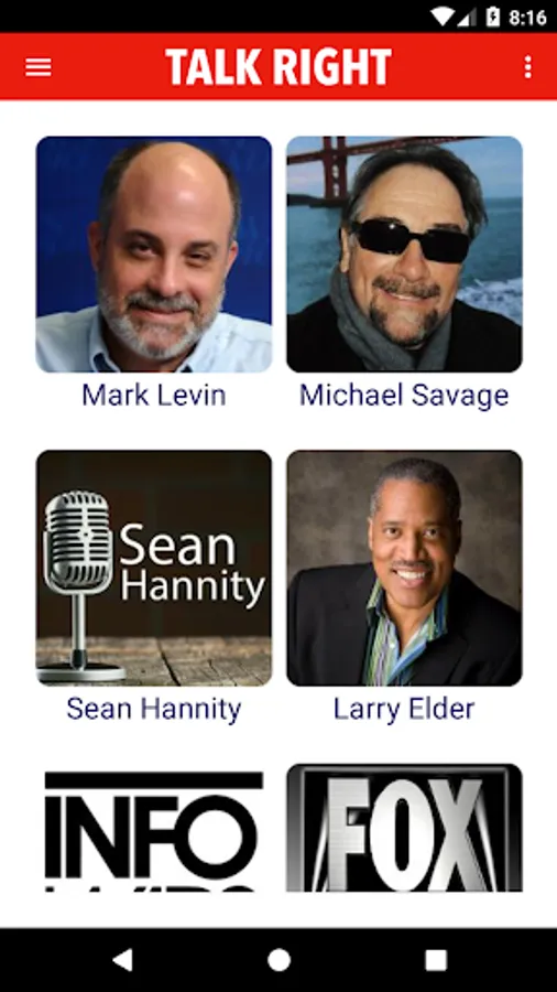 When your favorite talk show is Live it will appear on our app. We list and link to the most popular Conservative talk radio shows that include: Rush Limbaugh, Sean Hannity, Michael Savage, Laura Ingraham, Mark Levin and so many more.. that are ranked in real time by our users. Simply click on the icon of any show displayed and listen.