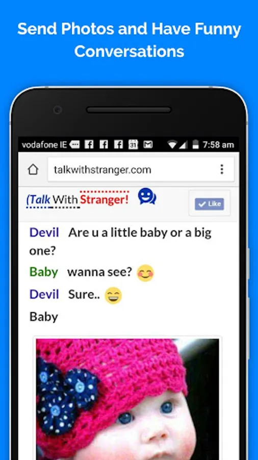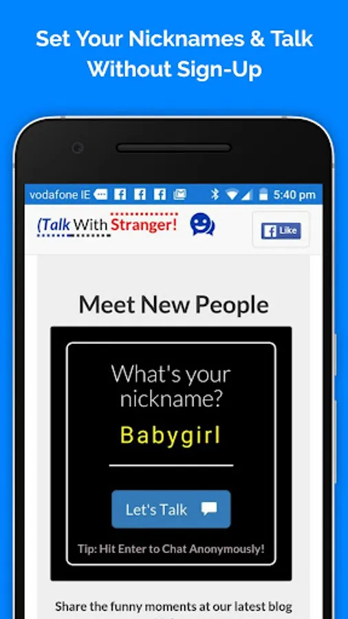 Talk With Stranger is the best free chatting app to make new friends by just tapping a button. It also allows you to set nicknames and send pictures. It is free and without any registration :)