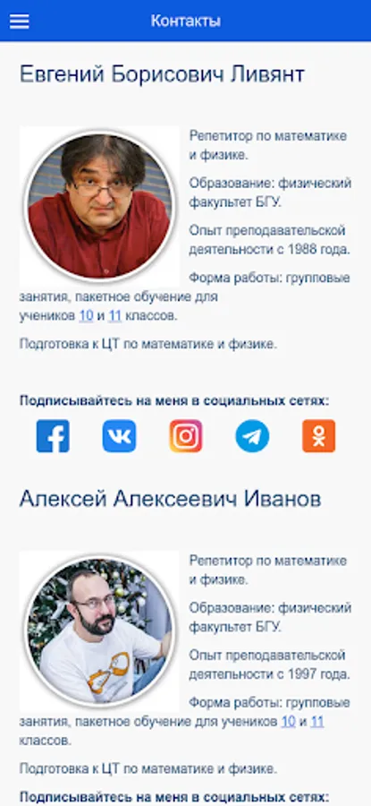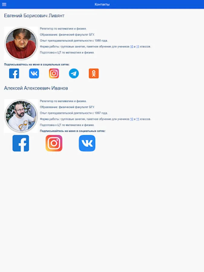 The mobile application is designed to work with tutors in mathematics and physics Livyant Evgeny Borisovich (teaching experience since 1988) and Ivanov Alexey Alekseevich (teaching experience since 1997).