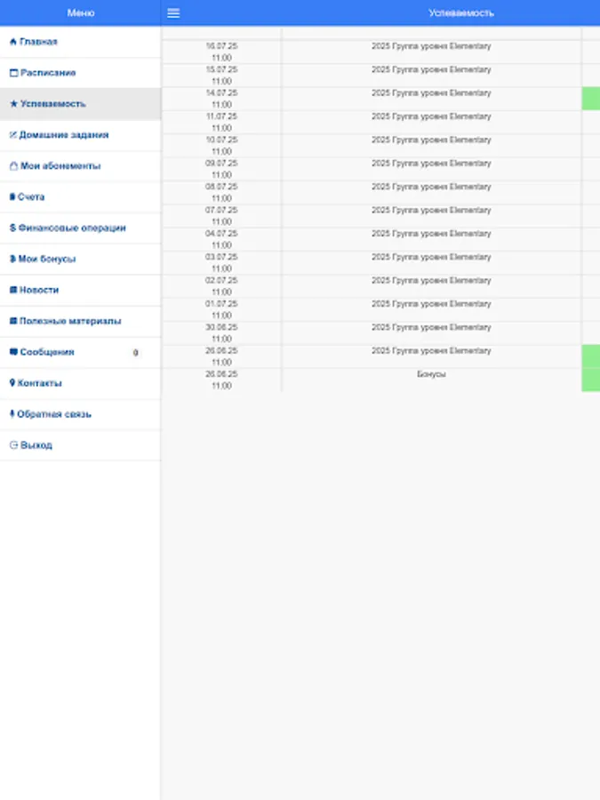 The application allows you to check the balance of classes in current subscriptions, payment transactions, homework, class results, see a mark on attendance and homework completion.