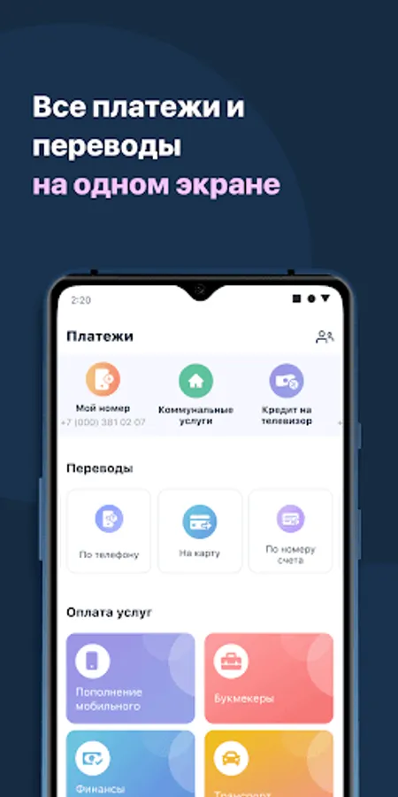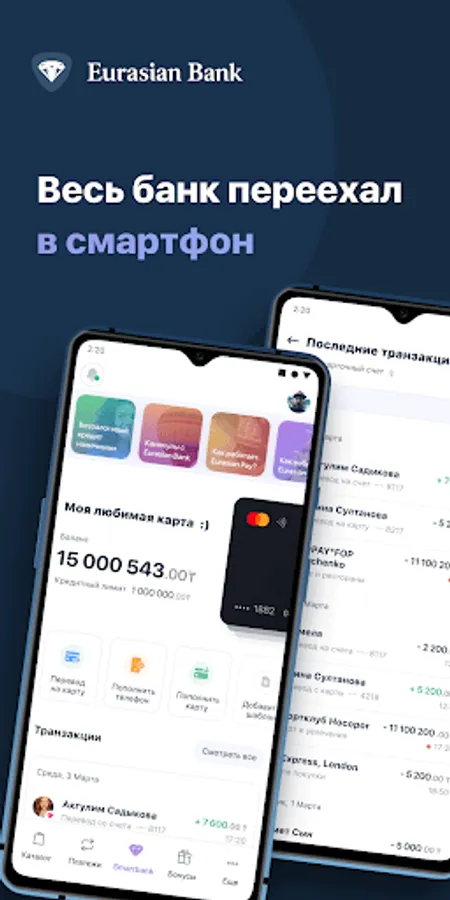 • Instant transfers to customers of the Eurasian Bank by phone number and international Swift transfers and transfers to another bank