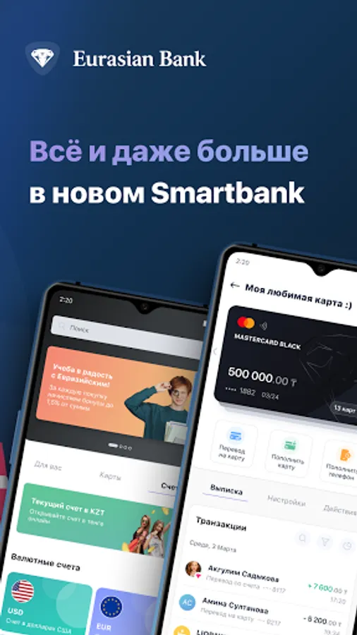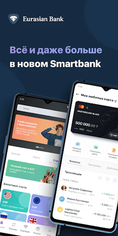 Smartbank is a mobile application of Eurasian bank, in which transfers, payments and 100% online card opening, deposit, account and loan processing are available, as well as other services for your daily needs.