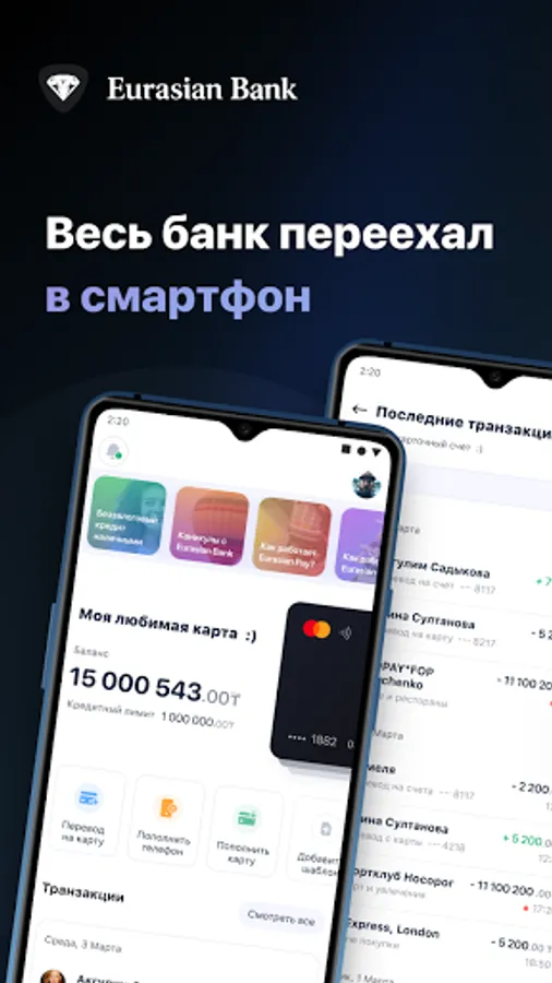 Smartbank-audarymdar, tolemder zhane 100% online modeinde cards, deposits, shotty ashu zhane nesienі rәsіmdeu, sondai-aқ kүndelіktі қazhettilikterіңіzge arnalғan basқa da қyzmetter қolzhetіmdі Eurasian Bank mobile kosymshasy.