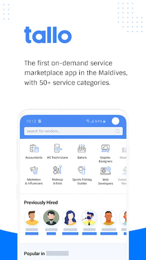 Using tallo app, customers can hire service providers (vendors) from over 50 service categories, for services like baking a cake, accounting, web design, photography, building a website, painting, programming, babysitting and many more.