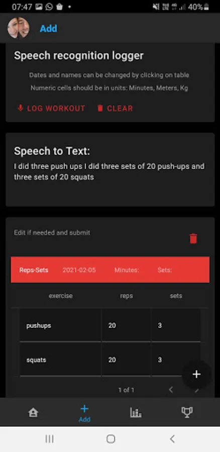Includes powerful speech recognition workout logging. Machine learning based, constantly improving.