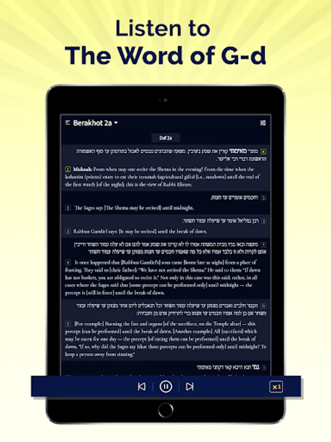 The app contains difference biblical halakha interpretations and bible studies from the Pentateuch (Jewish Torah: Bereshit, Shemot, Vayikra, Bamidbar, Dvarim & Devarim) and is relative to Halakha & Rambam, hazal , and biblical studies of different kinds such as Jewish Theology.