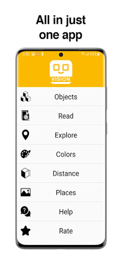 Vision uses Artificial Intelligence in real time to identify objects, colors, approximate distances, read text and more; all through your phone's camera. It's optimized for working with TalkBack in 48 languages; if it's not available in your language, please consider to install an external screen reader in your device. First, please verify that your phone is not in silence mode. Then, when you choose a feature, move the camera slowly in some directions to scan your surroundings. Vision has 6 features: