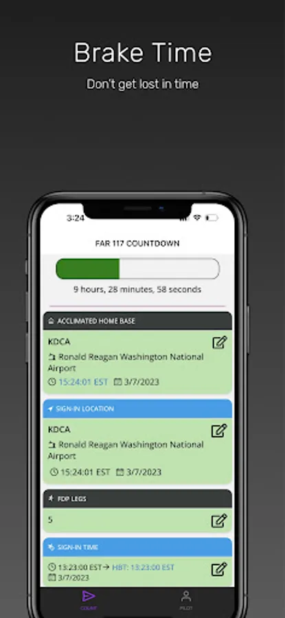 Input your acclimated home base, daily sign-in location, daily flight legs and sign in time to instantly see how much regulatory time you have remaining before you BrakeTime and go home!