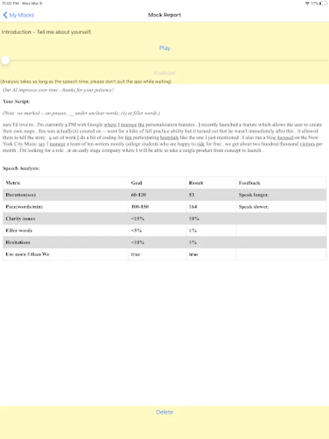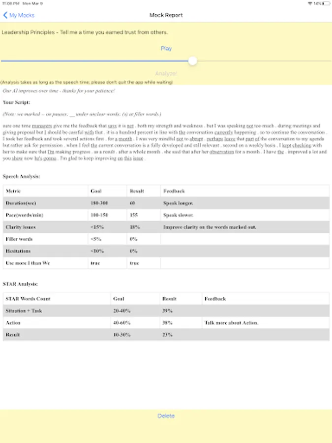 Metrics measured: Speech: duration, pace, clarity, filler words etc. STAR (Situation, Task, Action, Result).