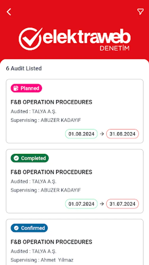 The Elektra Kalite Denetim application enables efficient execution of audit activities within your business. The application allows users to create new audits and view existing ones. During the audit process, detailed information can be entered for each audit question. This ensures that audits are conducted comprehensively and systematically.
