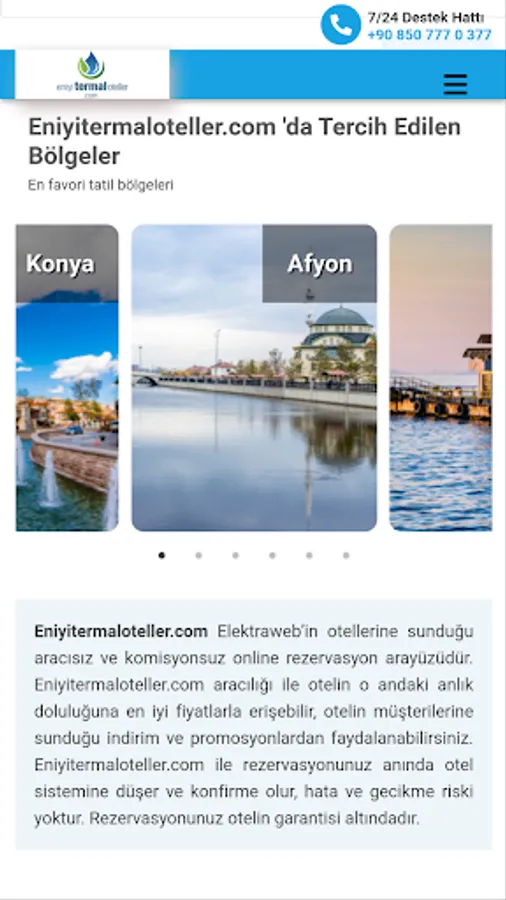 Best Thermal Hotels is Elektraweb's online reservation application without intermediaries and commissions for its hotels. Thanks to the Best Thermal Hotels, you can access the actual occupancy of the hotel at the moment at the best prices, and benefit from the discounts and promotions that the hotel offers to its best customers. With Best Thermal Hotels, your reservation will instantly enter the hotel system and be confirmed, there is no risk of error and delay; Your reservation is guaranteed by the hotel.