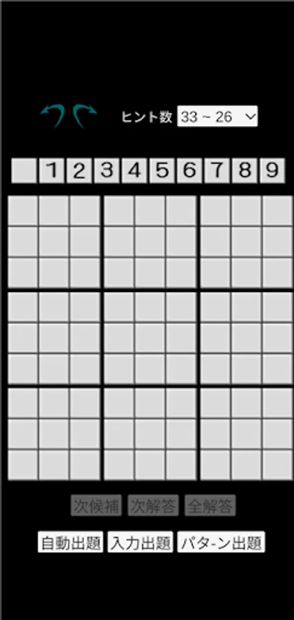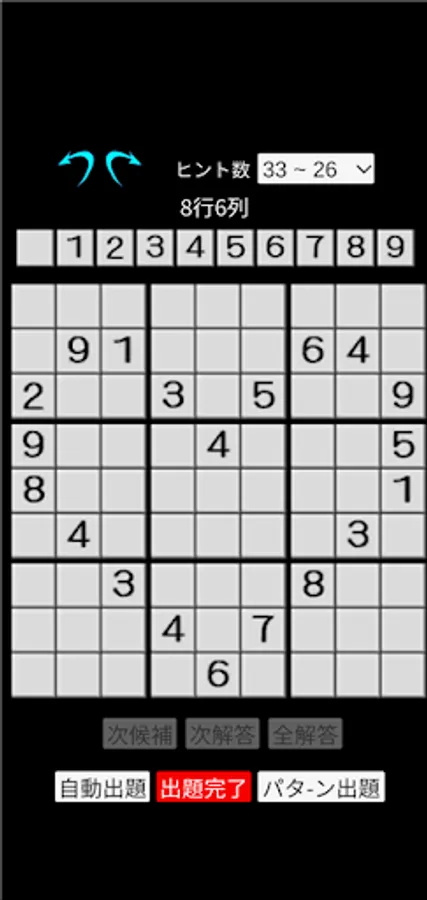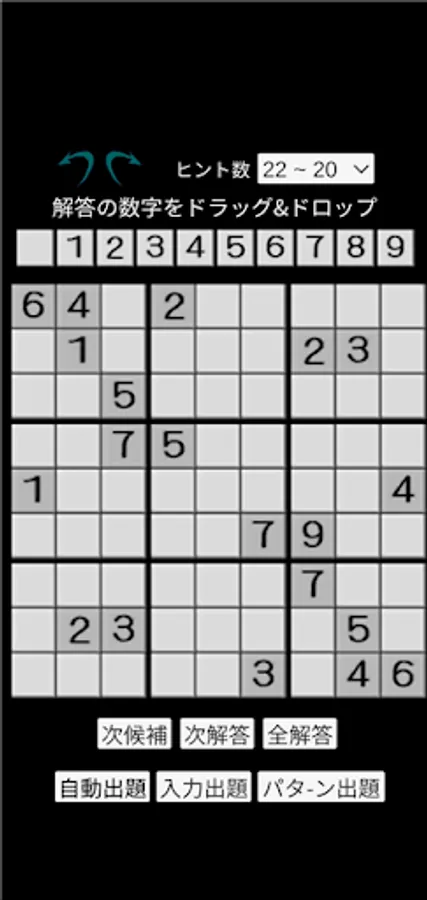 2) For "Input questions", drag and drop the number buttons 1 to 9 at the top of the screen to any square, enter hint numbers, and create a puzzle. To erase the entered number, use the unmarked button at the left end of the number button. To correct a number, overwrite another number, or use a clockwise (undo) or counterclockwise (redo) arrow. After completing the questions, tap the "Complete questions" button (the same button as the "Enter questions") to automatically verify whether there is a solution and then enter the answer mode.