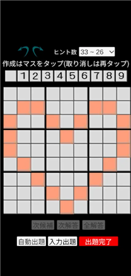 3) "Pattern question" is specified by tapping the square where the hint number is placed (when you tap the square, the background color of the square changes to orange, indicating that the position where the hint number is placed is specified. , Tap again to return to the original color and cancel the designation), Tap the "Pattern Complete" button (the same button as "Pattern Question") when you have finished specifying all the squares. This will automatically create a puzzle that matches the pattern of the specified square. However, if the number of specified cells is 16 or less, it will be created only as a non-unique solution puzzle. When the creation is completed, the answer mode will be set.