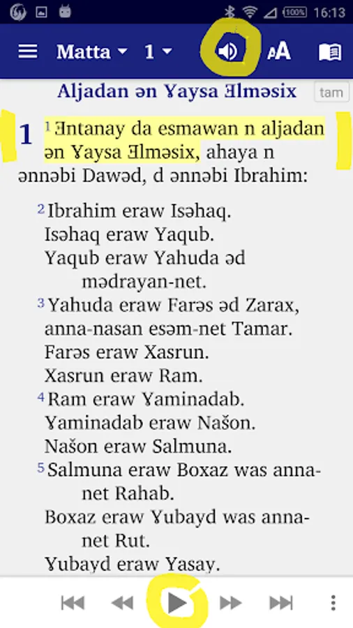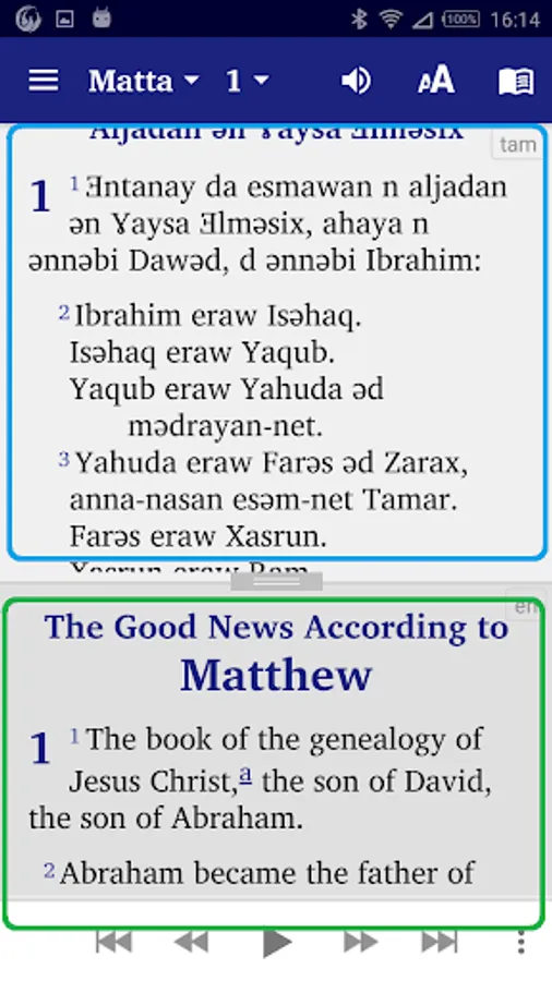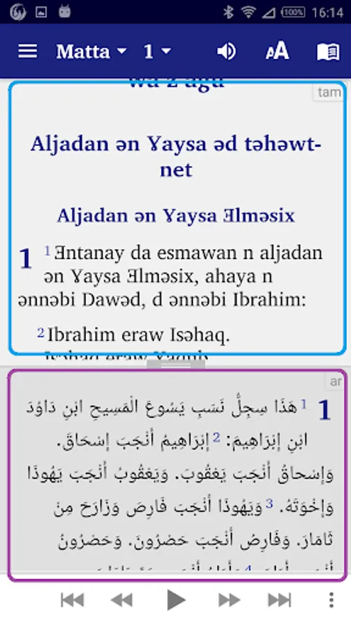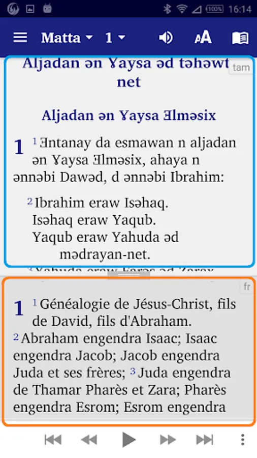 • Give your phone permission to download the audio files for the Tamajaq New Testament texts, however the text written does not exactly match the text read in this version. Once downloaded, the audio files will remain on your device for reuse in offline mode.