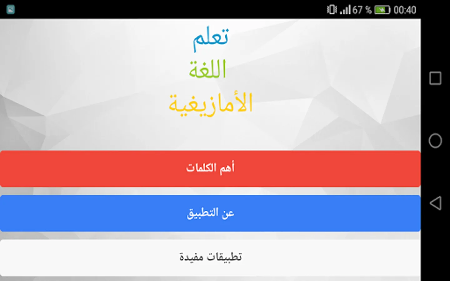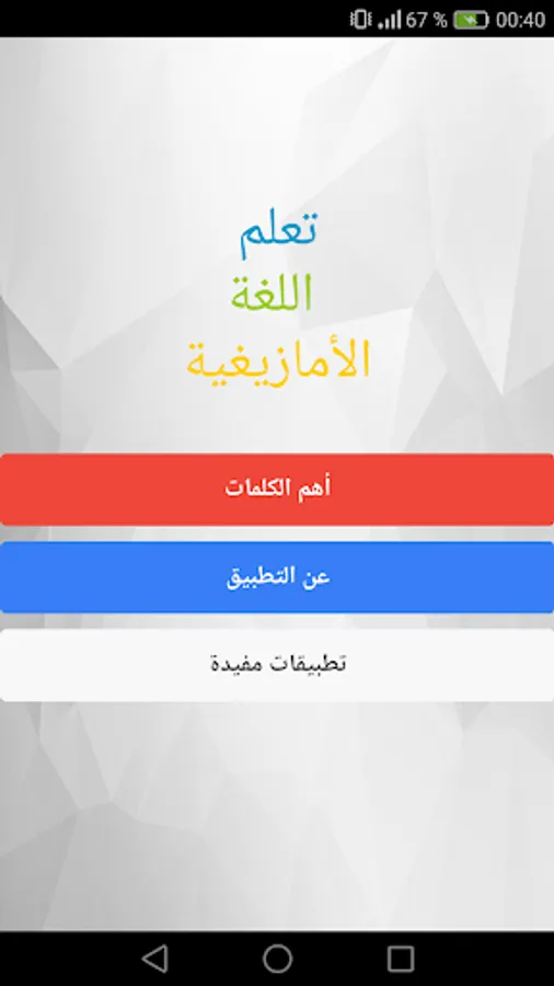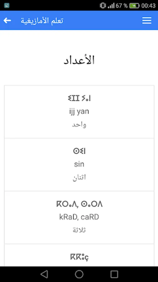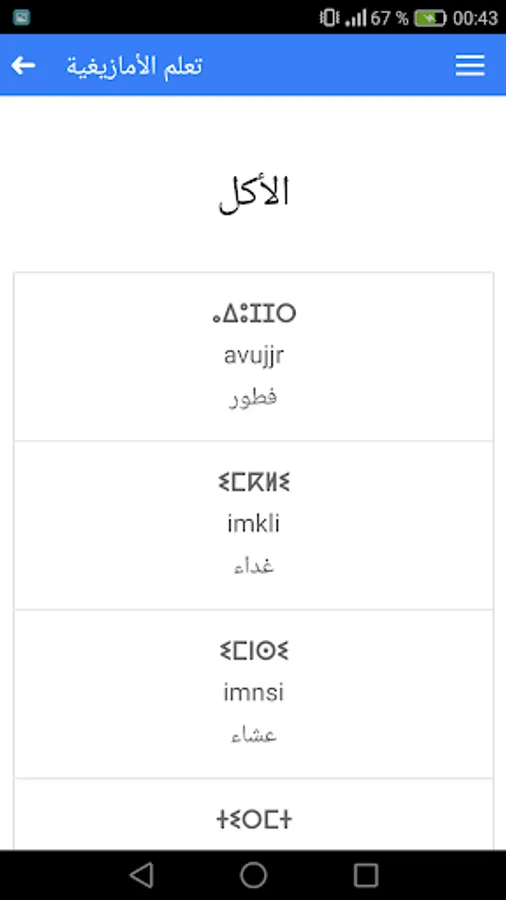 Amazigh education is to learn the Tamazight language an application without a Anturnt.alttbaiq lessons for beginners in the language and contains more than 1000 words traded on the daily life of learning and teaching Tamazight