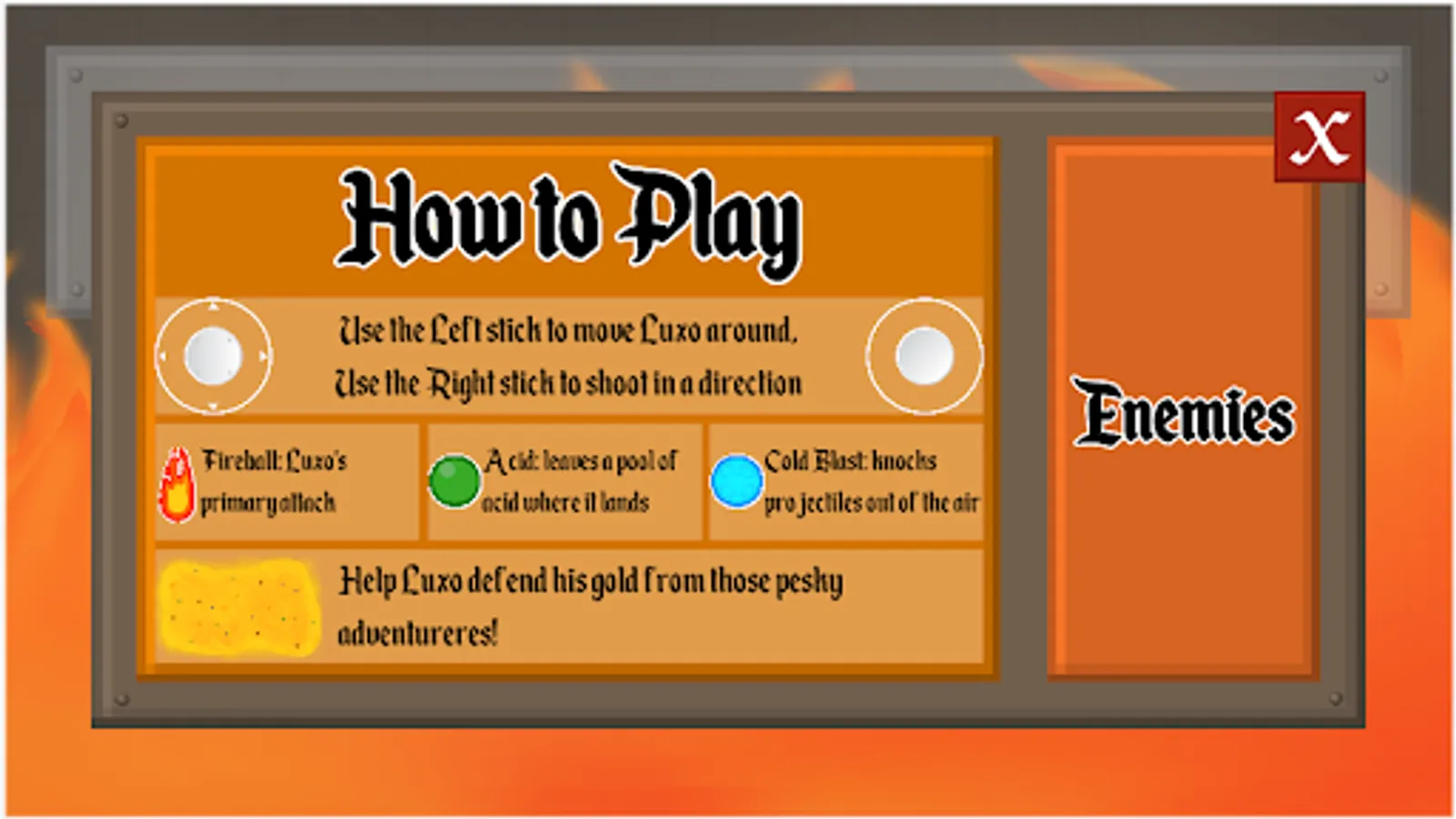 Play as Luxo, the dragon, while he defends his lair from pesky ‘adventurers’ who seek his treasure. The goal of the game is to stop as many adventurers as possible from stealing his treasures. The game is an endless, wave based casual shooter, with the player gaining points based on time, and completing waves.
