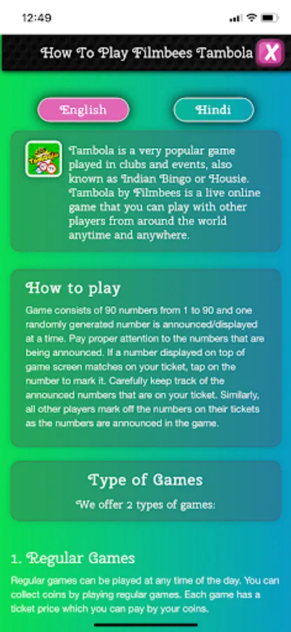 A. Regular Bingo games : You can play regular bingo games to collect coins which would help you purchase more tickets for Regular bingo games and would also reward you with surprise gifts like free diamonds to play event games. You can play regular 90 balls bingo games at any time of the day.