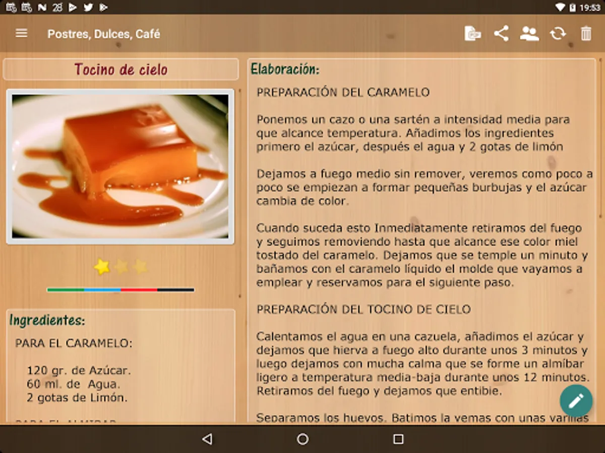 Share your recipes. We have created a store recipes in the cloud for users of the app can share their recipes. You can send recipes to store and search the store recipes that interest by category and language, see a preview, and if you're interested, import it directly to the App.
