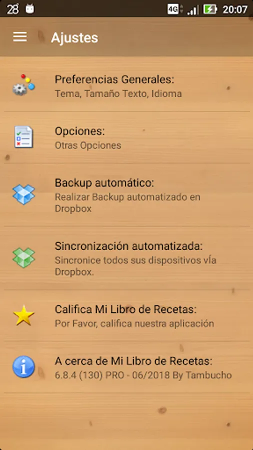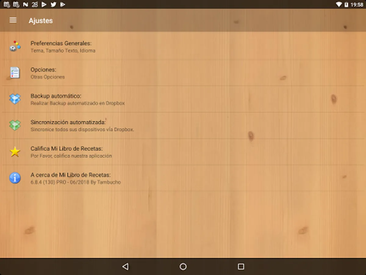 Sync with Dropbox, if you have multiple devices, or want to share your recipe book with your family, you can sync all with the same account Dropbox and thus be all updated (this option is not selected on the testing option (Trial).