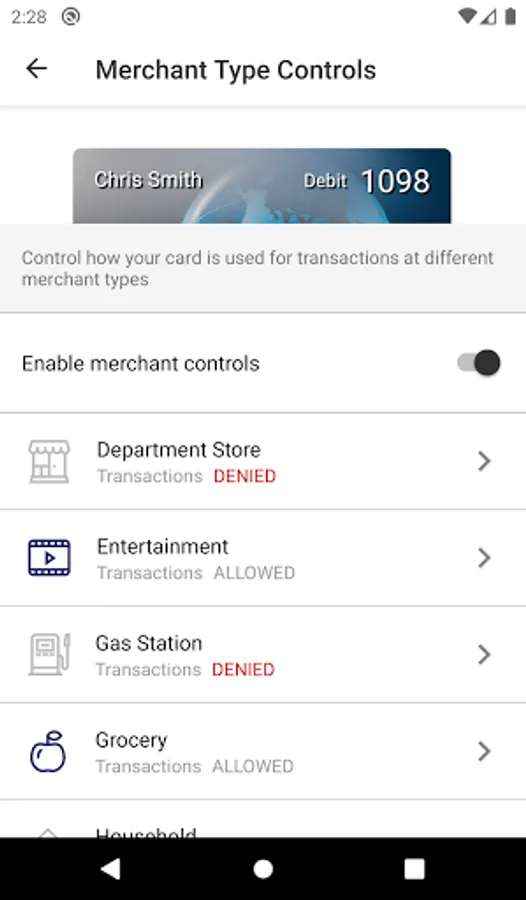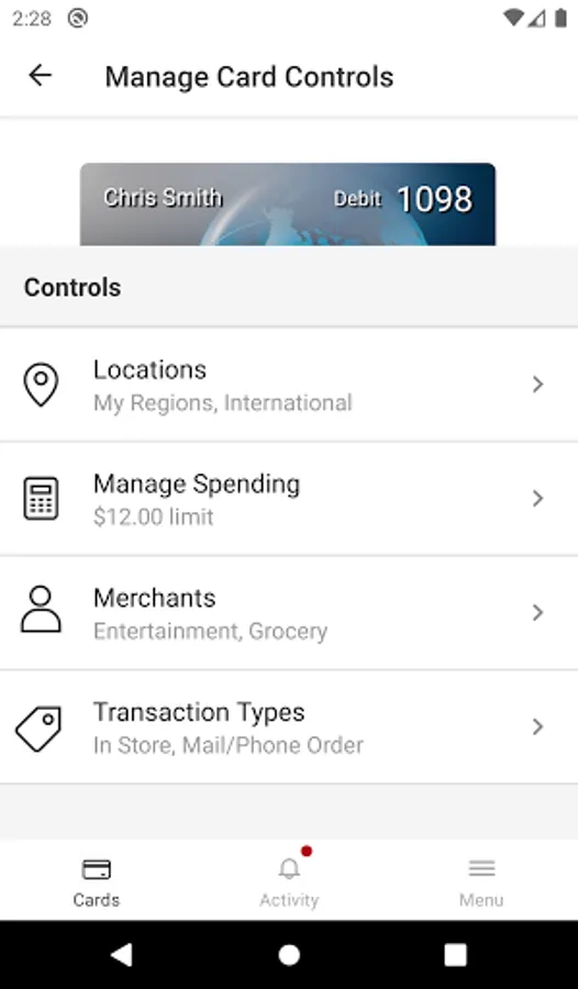Spending limits can be established to allow transactions up to a certain dollar value and decline transactions when amounts exceed your defined thresholds. Transactions can be monitored and managed for specific merchant categories such as gas stations, department stores, restaurants entertainment, travel, and groceries. And your transactions can also be monitored for specific transaction types: in-store purchases, e-commerce transactions, mail/phone orders and ATM transactions.