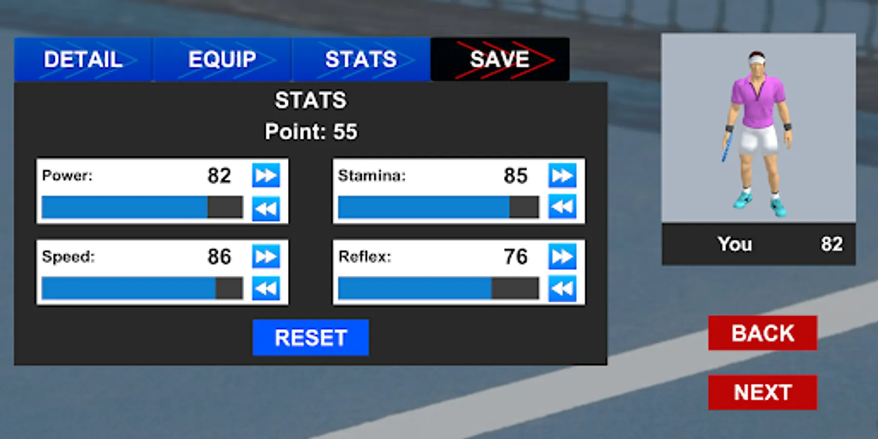 - Customize player as you want with height, racket, clothes...