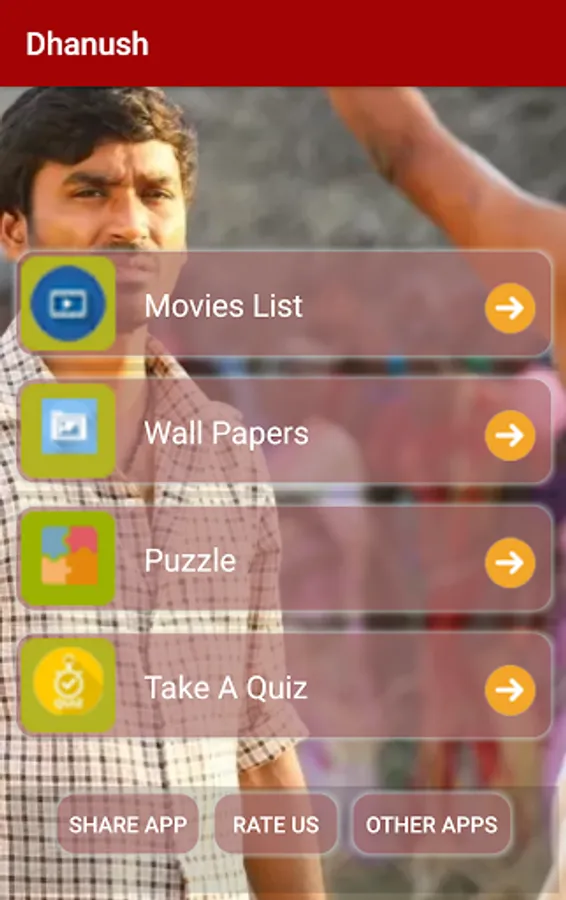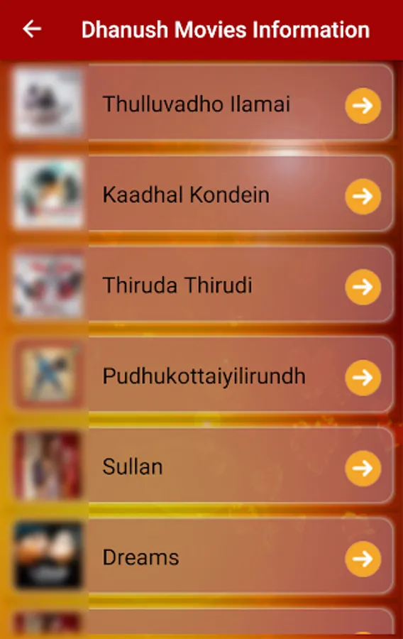 This Application displays the information of Dhanush movies, it will not play any video or audio of his movies, it is a multipurpose application to Dhanush fans, and App contains four options.