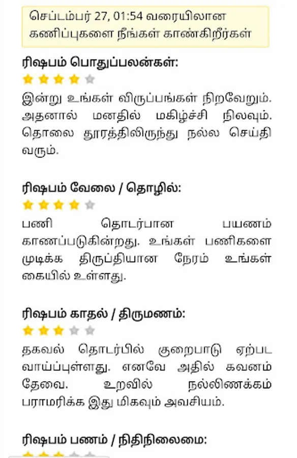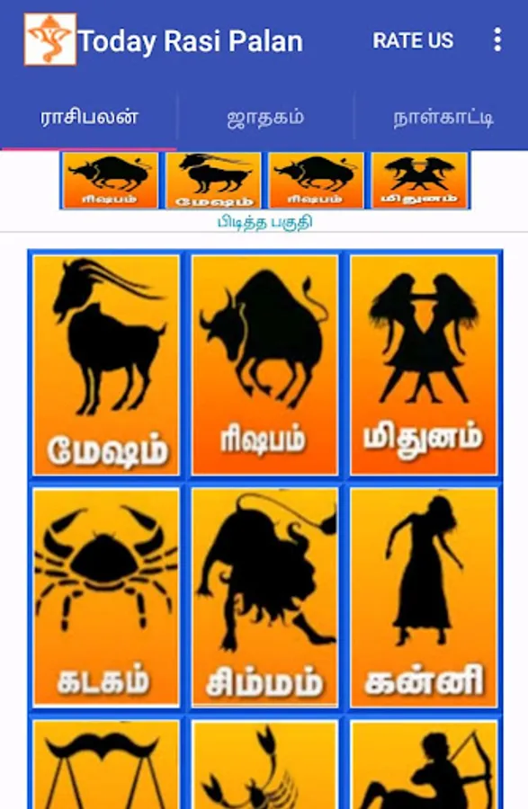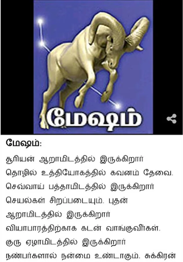This app also provides Guru Peyarchi, Sani Peyarchi, Ragu Kethu Peyarchi, Tamil Jathgam software, தமிழ் ஜாதகம் and many other utilities apart from Todays Rasipalan.