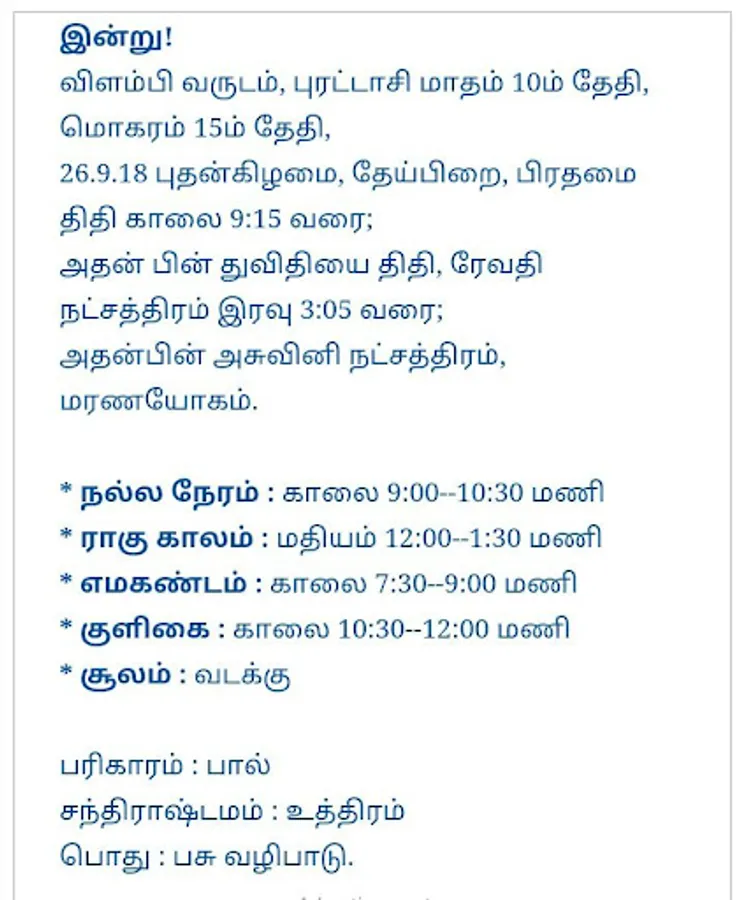 It is very important to start a new work on an auspicious day with respect to your rasi and nachathiram. We have added the following features to this Indraya Rasi Palan app.
