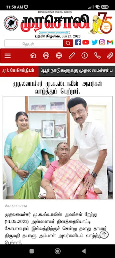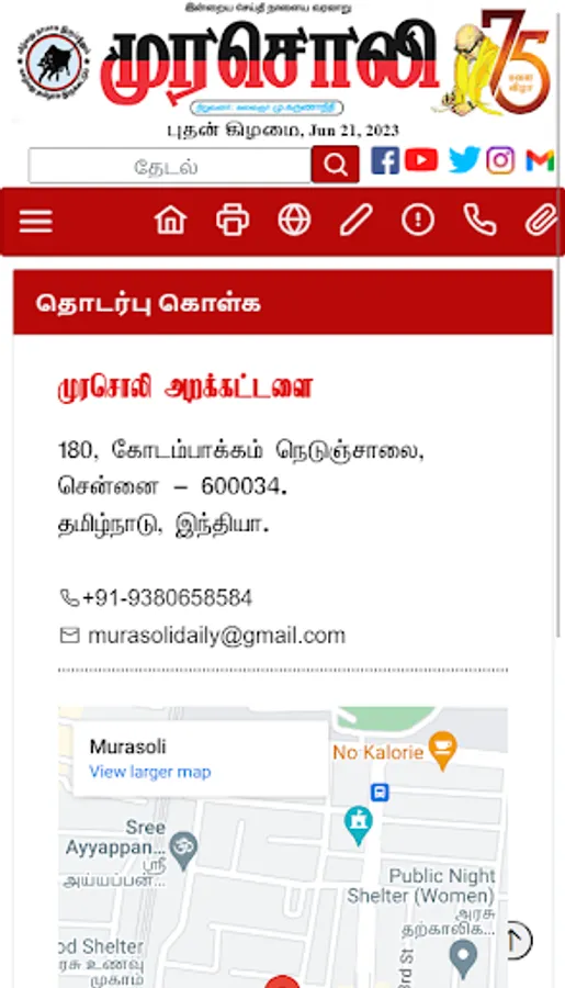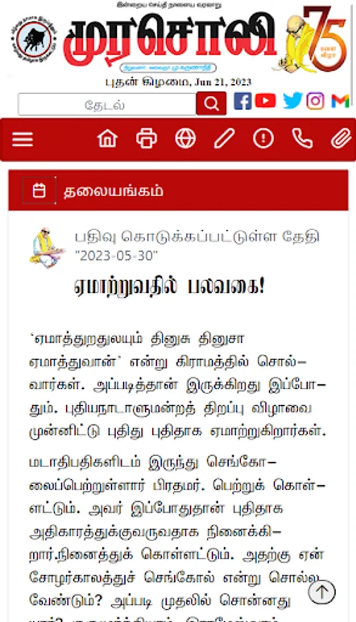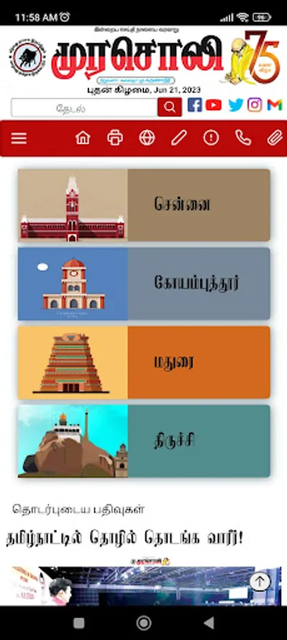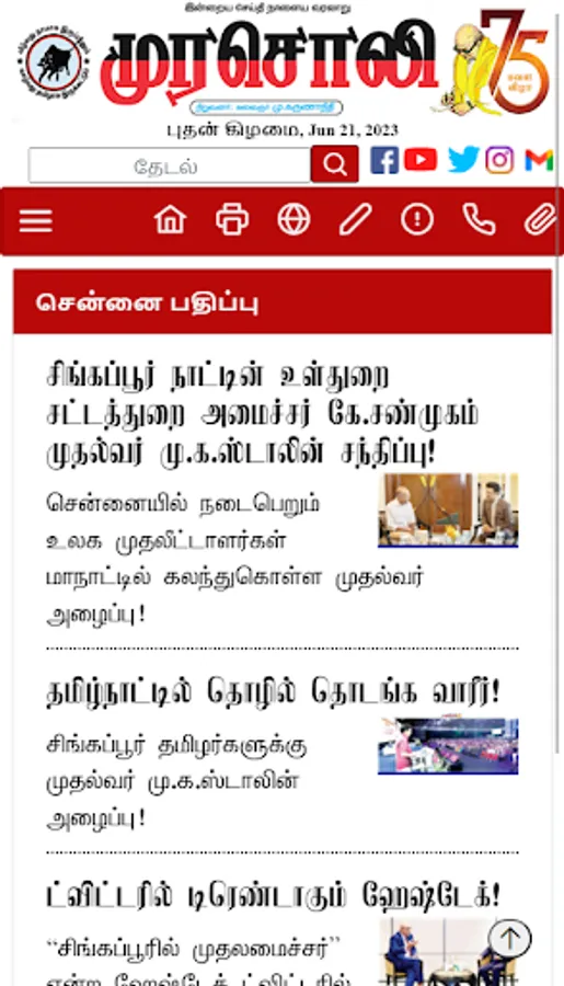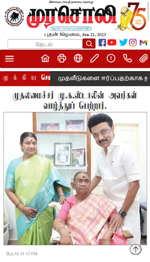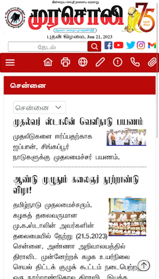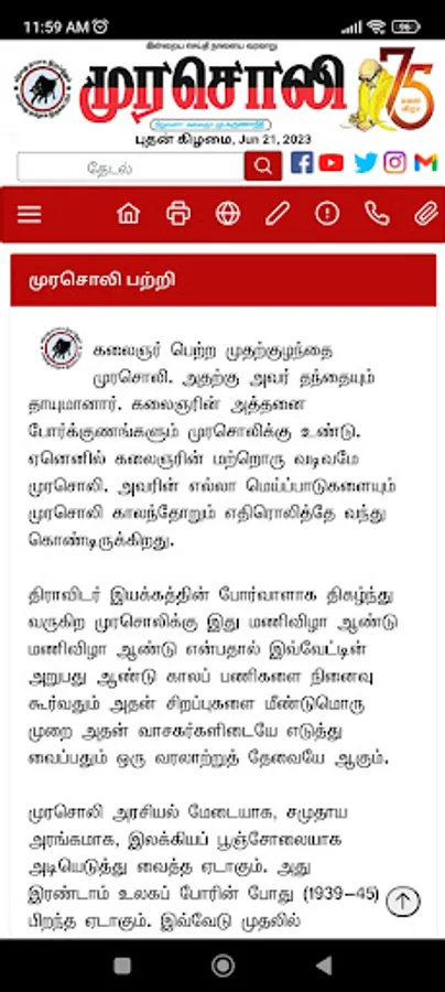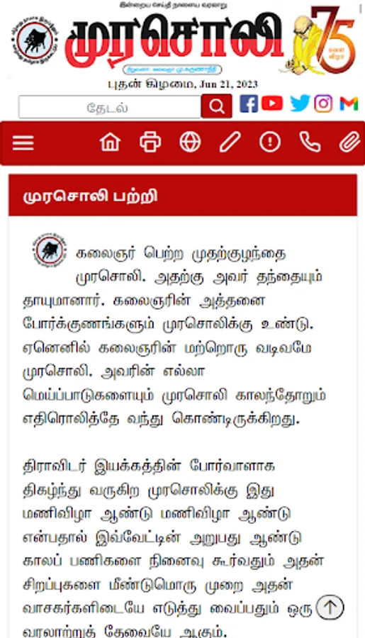 Murasoli was started in Tiruvarur on 10 August 1942, during the World War II, by 18-year old M. Karunanidhi. Its earliest editions were in form of handwritten notices authored by Karunanidhi under the pen name "Cheran". The newspaper headquarters were moved to Chennai in 1954. From 17 September 1960, it has been published as a daily. As of 2017, the newspaper has a circulation of 70,000 copies.