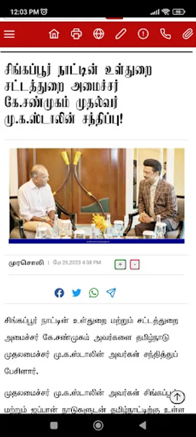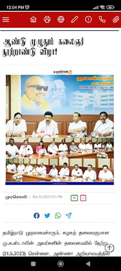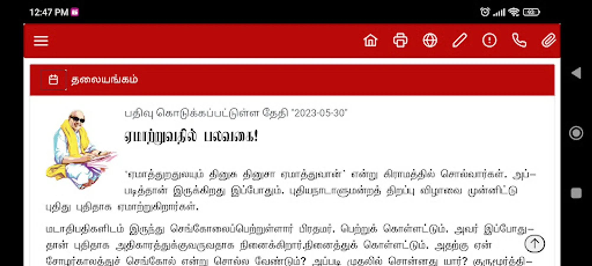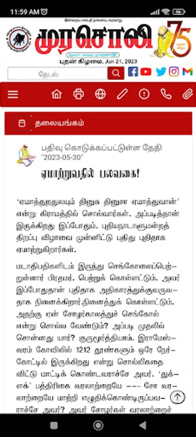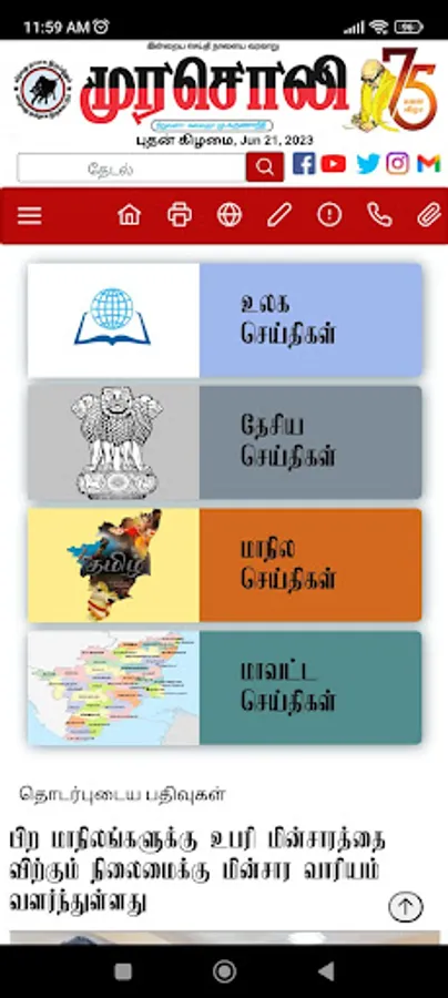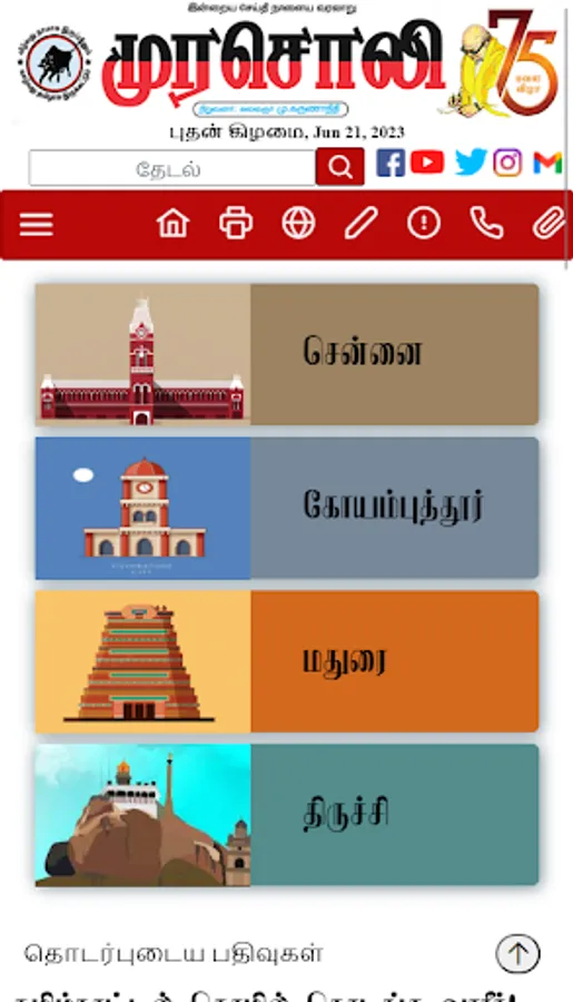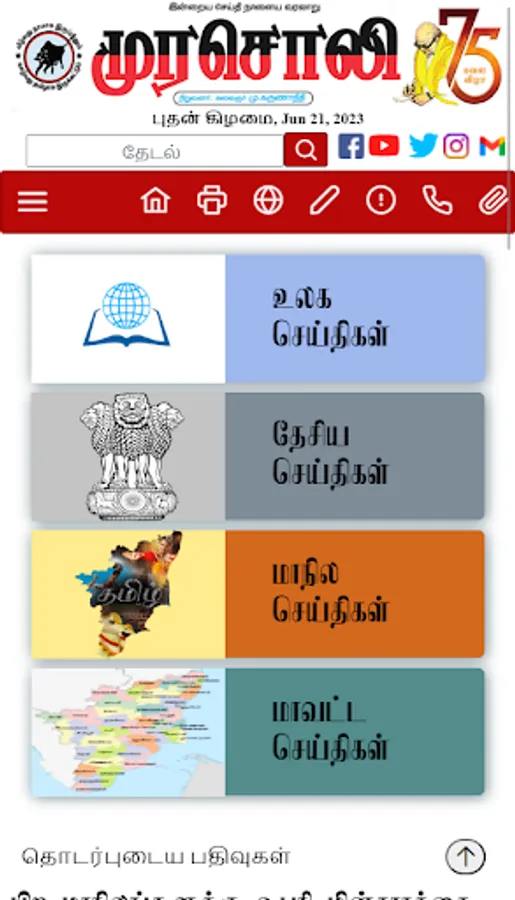 Murasoli was started in Tiruvarur on 10 August 1942, during the World War II, by 18-year old M. Karunanidhi. Its earliest editions were in form of handwritten notices authored by Karunanidhi under the pen name "Cheran". The newspaper headquarters were moved to Chennai in 1954. From 17 September 1960, it has been published as a daily. As of 2017, the newspaper has a circulation of 70,000 copies.