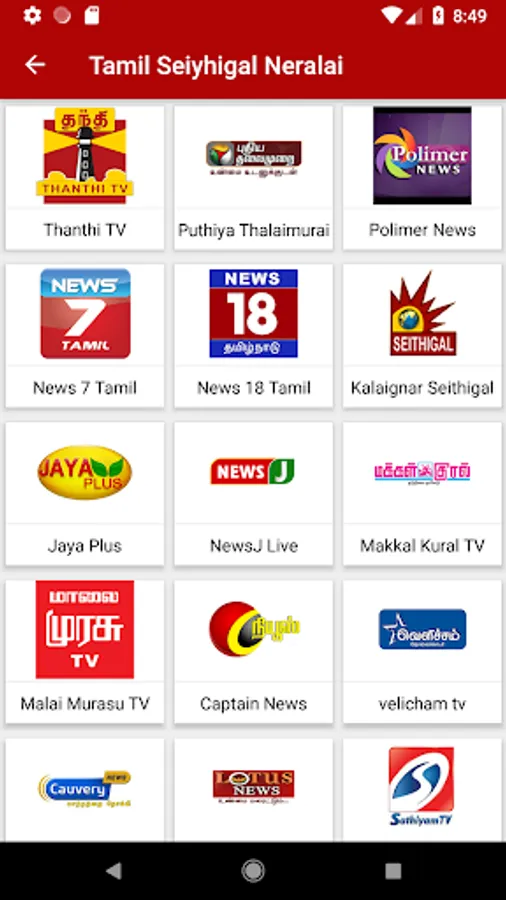 Thanthi TV, Puthiya Thalaimurai tv, Polimer News, News 7 Tamil, News 18 Tamil, Kalaignar Seithigal, Jaya Plus, NewsJ Live, Makkal Kural TV, Malai Murasu TV, Captain News, velicham tv, Cauvery News, Lotus News, Sathiyam News, Vasanth Tv, Madhimugam Tv, Vendhar Tv, DD Pothigai, DD News LIVE (24x7)