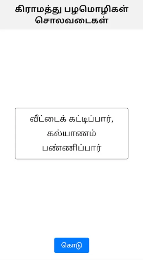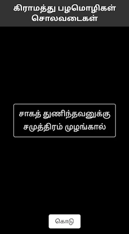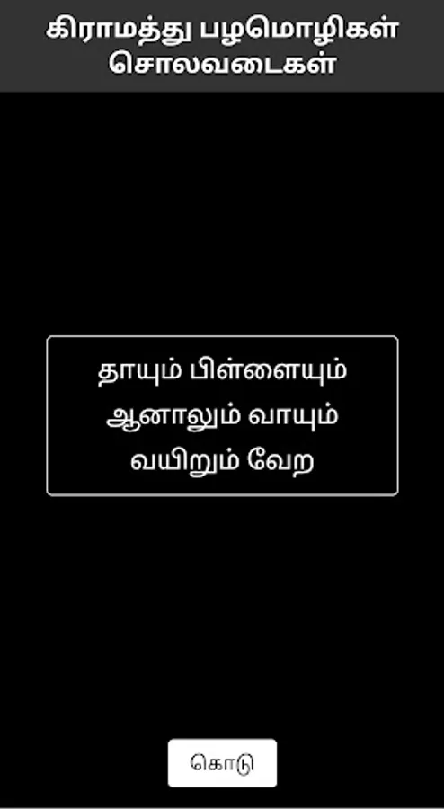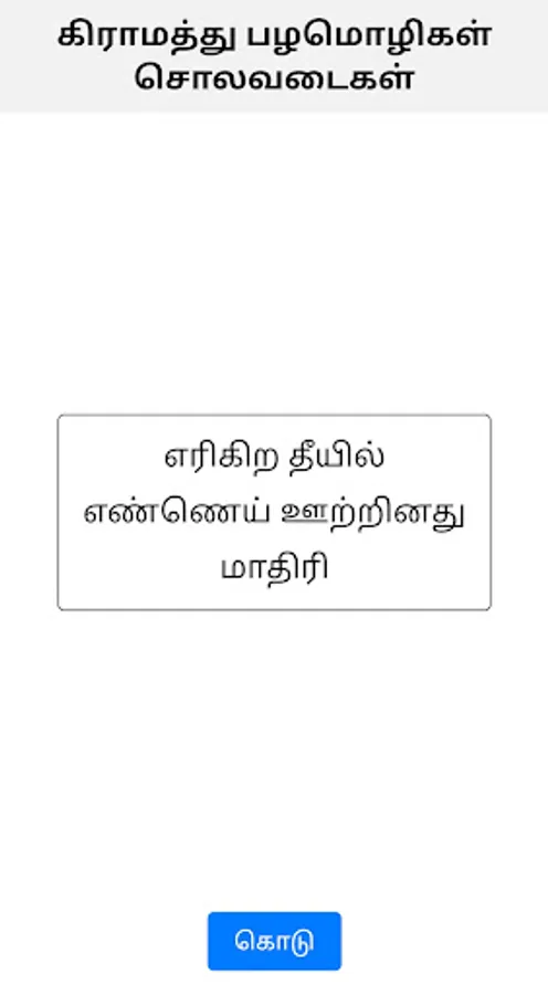 ஒரு எளிய கிளிக் மூலம் தமிழ் பழமொழிகளின் செழுமையை ஆராய்ந்து பகிர்ந்து கொள்ள இது உங்களை அனுமதிக்கிறது, அனைவருக்கும் பகிர்ந்து கொள்ள மகிழ்ச்சியையும் தருகிறது.