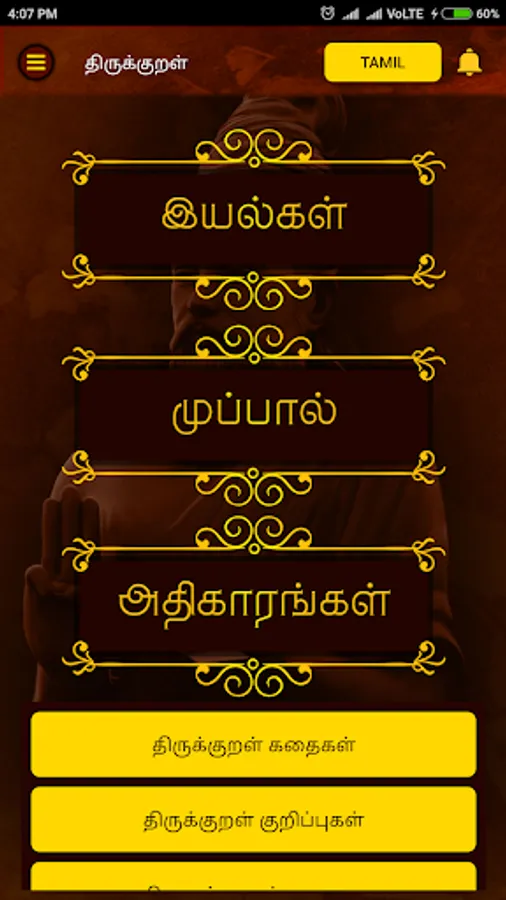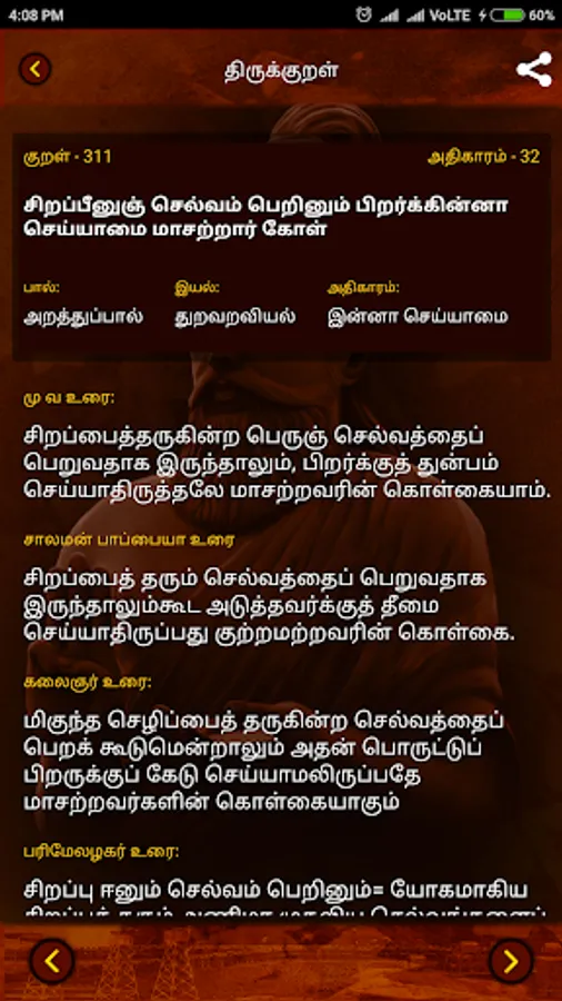 The Thirukkural or Thirukural is one of the most important works in the Tamil language. Thirukkural is reflected in some of the other names by which the text is given by such as Tamil marai, poyyamozhi, Deiva nool. Thirukkural is structured into 133 chapters, each containing 10 couplets, for a total of 1330 couplets. We provide a better application with English translation and thirukkural meaning. You can get meaning from three different authors who explains the meaning of kural in 3 different ways.