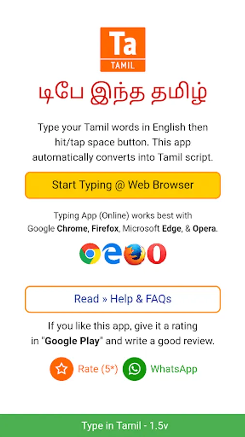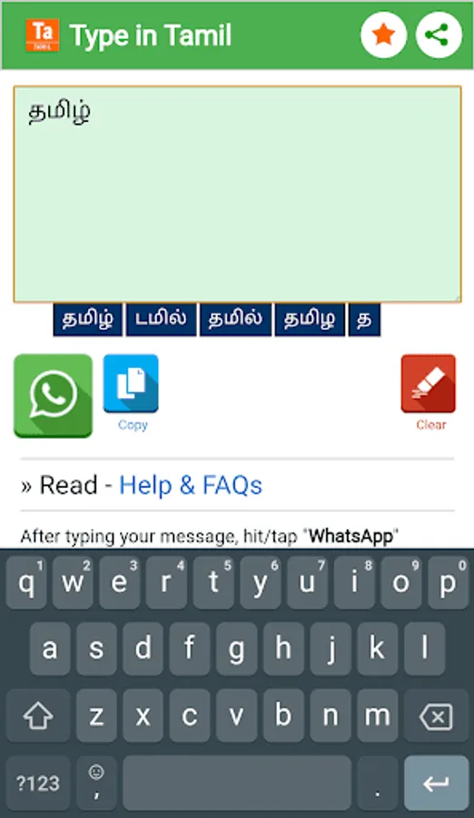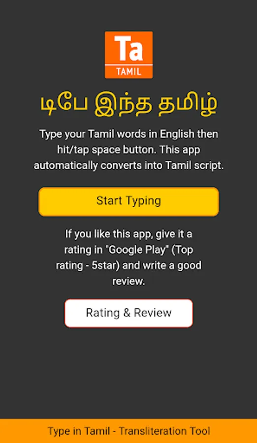Type Tamil Words in English then press/tap SPACE button. This App automatically transliterated phonetically into Tamil Script.